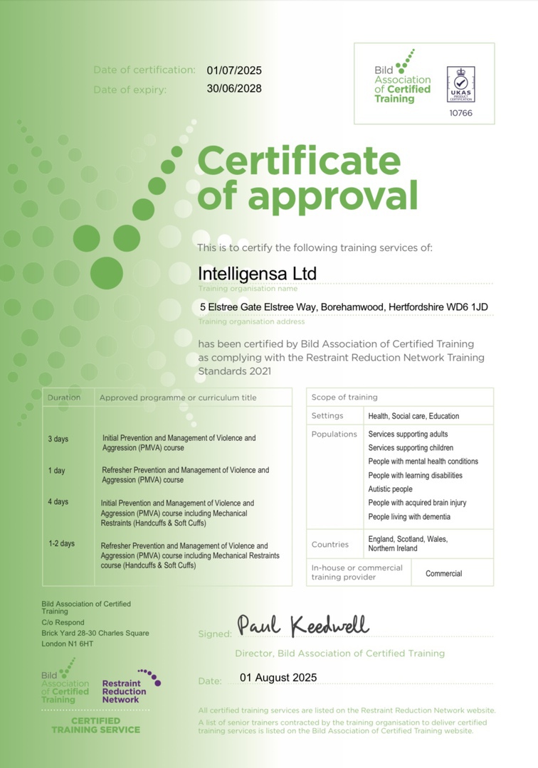 BILD certified training includes: Positive Behaviour Support (primary strategies), De-esclation, Breakaway skills, Restraint training and the use of restraint equipment such as handcuffs and soft cuffs. All training is focused on restraint reduction.